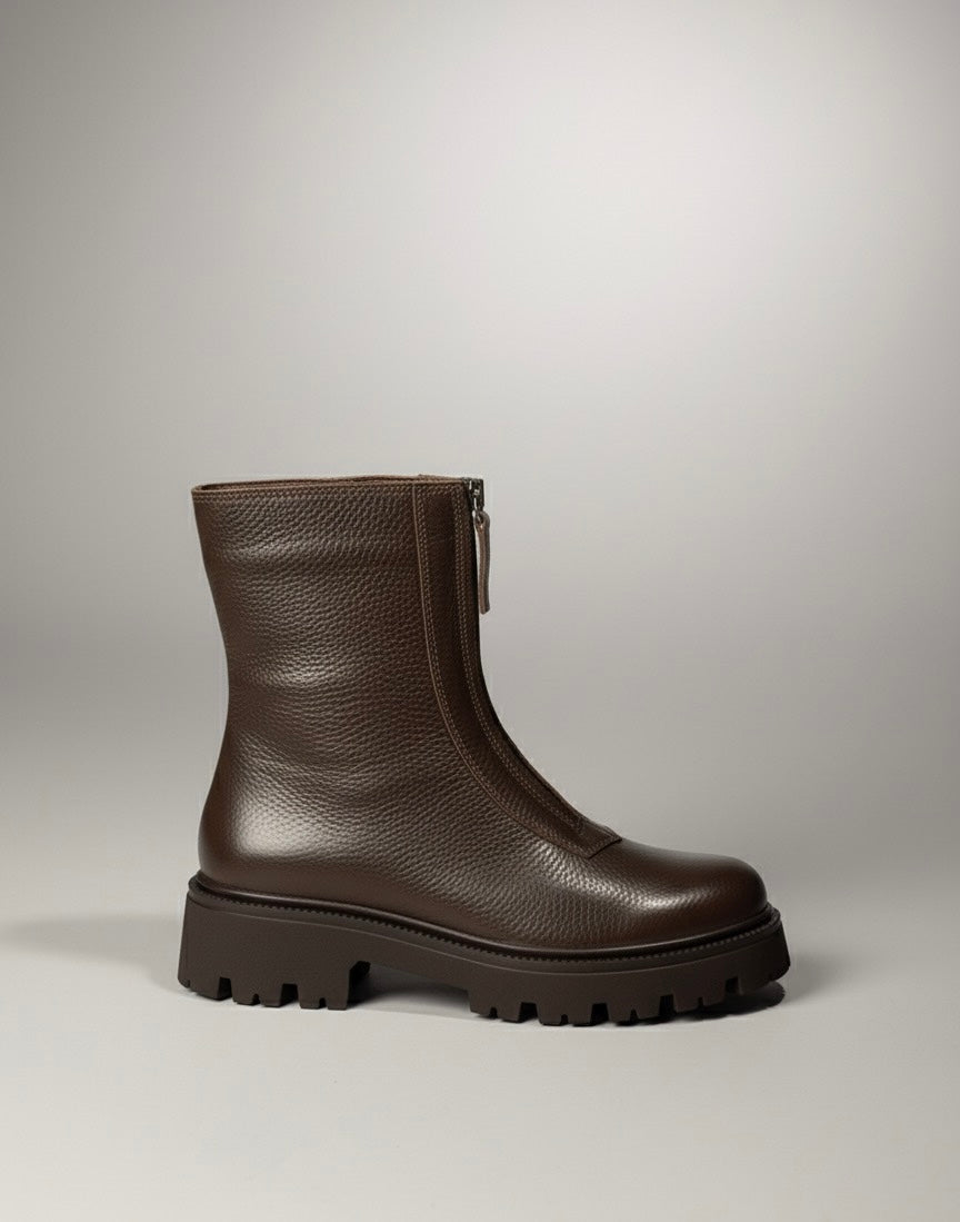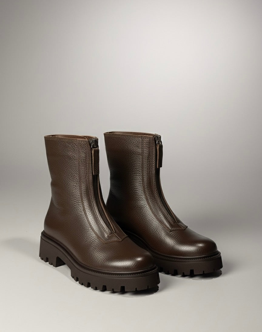 Materiali: Lëkura është cilësore, me teksturë kokrrizore (pebble grain), e cila shton thellësi dhe qëndrueshmëri. Çizmet paraqiten në dy ngjyra klasike dhe të gjithanshme: e zezë dhe kafe e errët/çokollatë.