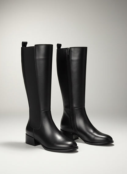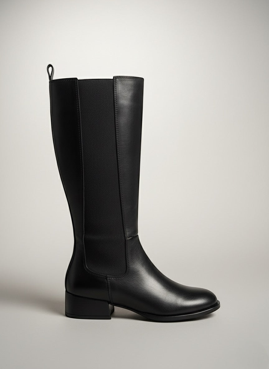 Të punuara nga lëkurë 100% e cilësisë së lartë në ngjyrë të zezë klasike. Ato kanë një dizajn të rafinuar me një panel elastik anësor për përshtatje të rehatshme dhe mbyllje me zinxhir. Të kompletuara me një takë të ulët, katrore, këto çizme janë zgjedhja perfekte për stil dhe komoditet gjatë ditës.