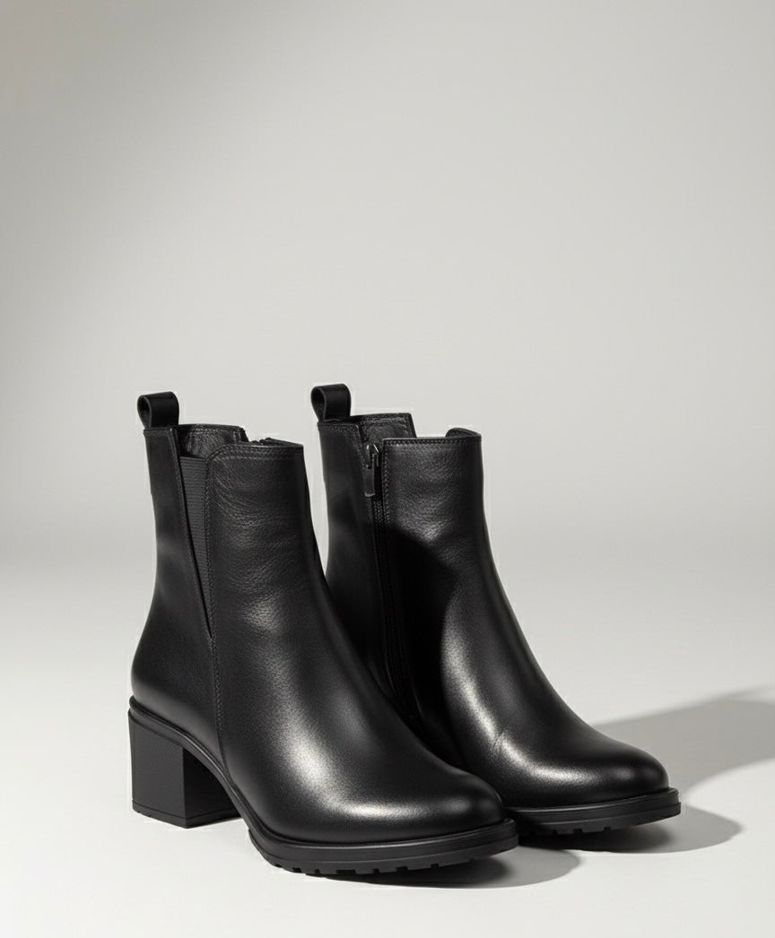 Këto janë një palë stivale të shkurtra (ankle boots), të bëra nga lëkurë e zezë, e lëmuar.