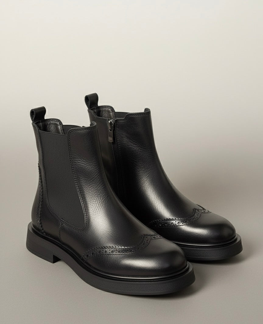 Një çizme Chelsea prej lëkure të zezë, brogue, me detaje klasike të majës së krahut (brogue) përgjatë majës së gishtit dhe qepjeve. Ka një taban gome pak të trashë dhe të sheshtë, dhe fiksohet me një mbyllje anësore me zinxhir dhe panele anësore elastike (ose vetëm me zinxhir, varësisht nga imazhi i dytë). Lëkura duket se ka një teksturë delikate në bosht, dhe një buton tërheqës është në pjesën e pasme. Përzien pamjen tradicionale të një çizmeje brogue me një siluetë moderne dhe praktike deri në kyçin e këmbës.