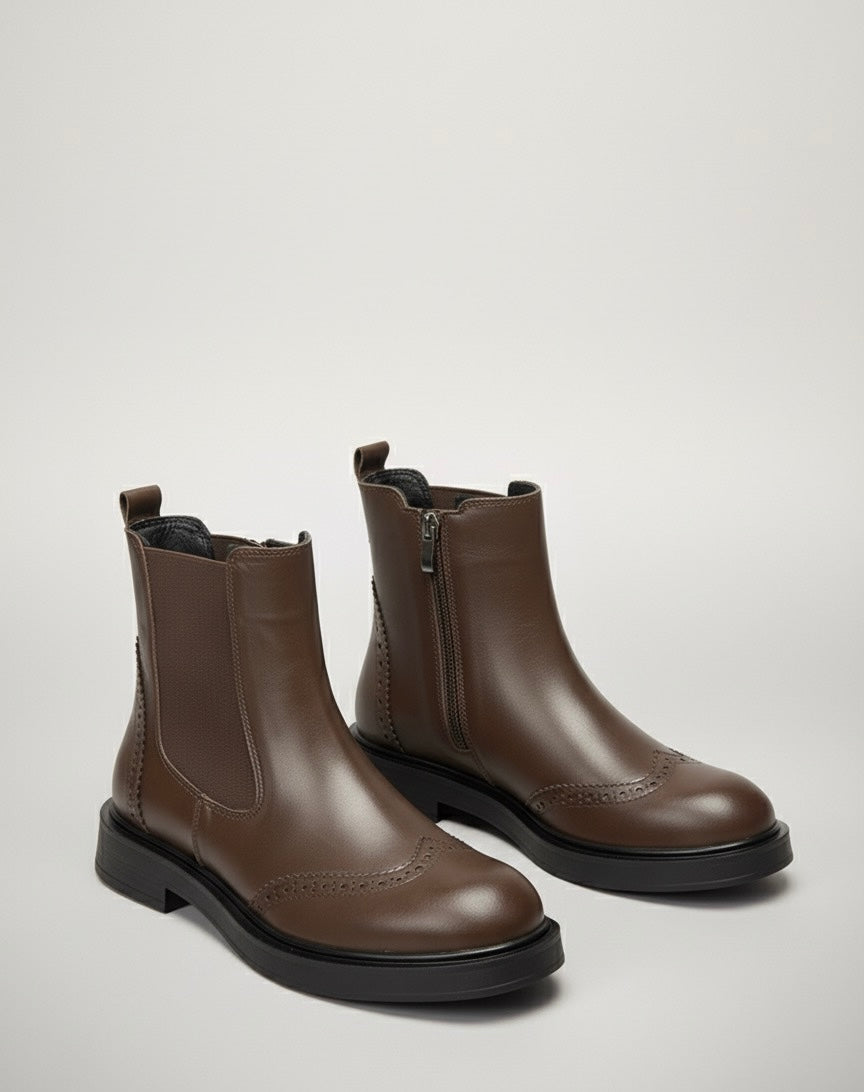 Një çizme Chelsea prej lëkure të zezë, brogue, me detaje klasike të majës së krahut (brogue) përgjatë majës së gishtit dhe qepjeve. Ka një taban gome pak të trashë dhe të sheshtë, dhe fiksohet me një mbyllje anësore me zinxhir dhe panele anësore elastike (ose vetëm me zinxhir, varësisht nga imazhi i dytë). Lëkura duket se ka një teksturë delikate në bosht, dhe një buton tërheqës është në pjesën e pasme. Përzien pamjen tradicionale të një çizmeje brogue me një siluetë moderne dhe praktike deri në kyçin e këmbës.