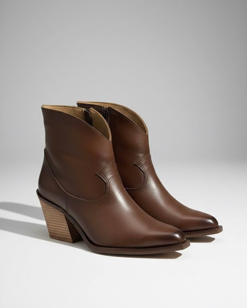 Të punuara nga lëkurë e butë, këto çizme kanë një majë të theksuar, detaje delikate qepjesh cowboy dhe një takë të trashë të rehatshme. Dizajni i gjithanshëm është i përshtatshëm për të ngritur veshjen, duke filluar nga xhinset e deri tek fustanet. Në dispozicion në ngjyrë klasike të zezë ,  kafe të pasur dhe suede të zezë të ngrohtë me takë me efekt druri natyral. Ndërthurin pa mundim sharmin e fortë me sofistikimin modern.