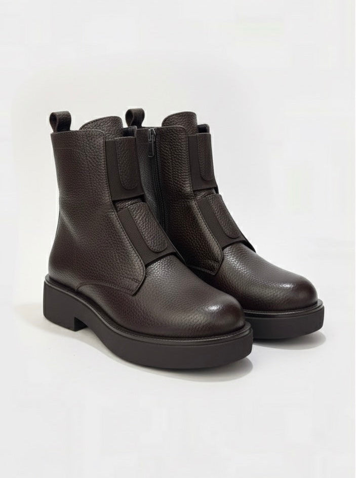 Këto janë një palë çizme moderne dhe të theksuara, 100% lëkurë, me një pamje të theksuar. Ato paraqesin një dizajn mid-top me lëkurë të theksuar me kokërr (shagrene), duke i dhënë një cilësi të pasur dhe të qëndrueshme. Detaji kryesor është shiriti i gjerë elastik horizontal mbi pjesën e këmbës, i cili ofron rehati dhe një stil unik, duke zëvendësuar lidhëset tradicionale. Çizmet kanë një taban të trashë, të profilizuar (lugsole) në ngjyrë të zezë mat, duke shtuar lartësi dhe duke garantuar stabilitet. Një zinxhir praktik në anë ndihmon në veshjen dhe heqjen e lehtë. Këto janë çizme perfekte për një pamje të sofistikuar por rastësore, duke kombinuar elegancën me funksionalitetin.